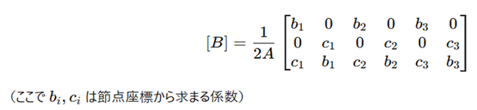 1.Bマトリクス 2025 11/08 備忘録 FEM解析 2015年4月1日2025年11月8日 ひずみと節点変位との関係を表したマトリクス。マトリクスの成分は、形状関数の座標による一次微分からなる。 【定義】 { ε } = [ B ] { d } 🔹 例:2次元三角形要素(CST要素)の場合 線形三角形要素では、Bマトリクスは要素内で一定になる。 備忘録 FEM解析 FEM解析 1.遊離石灰とエフロレッセンス 1.断面修復材 関連記事 33.マスコンクリートのひび割れ制御指針2025 2025年10月31日 28.支承の変遷 2025年5月5日 29.塗膜除去_分析 2025年4月7日 32.断熱温度上昇式のパラメータ 2025年3月5日 27.鋼桁のケレンと塗装 2025年2月2日 26.ひび割れモードとかぶり 2025年1月5日 25.中性化 2024年12月2日 38.外ケーブルのモデル化に関する注意事項 2024年5月5日