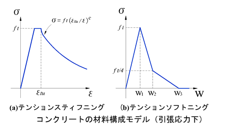 ひび割れ発生による剛性低下の評価法。ひび割れ後のコンクリートの応力ひずみ関係に軟化関数を用いる方法。 ひび割れ間のコンクリートが引張力を負担する効果をその領域で均質化するモデル。