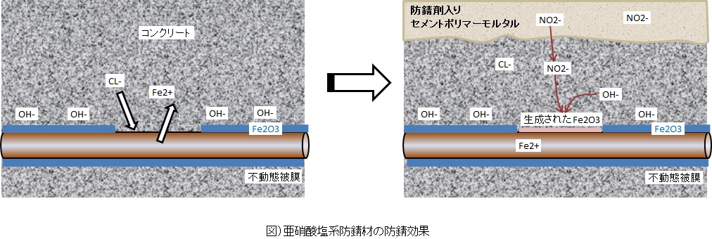 亜硝酸イオン(NO2-)と第一鉄イオン(Fe2+)とが反応することによって、アノード部からのFe2+の移動が阻害され、 Fe2O3として鉄筋表面に沈着し、不動態被膜を形成する。