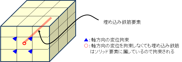 下図では埋め込み鉄筋が属しているソリッド要素の節点を拘束すればOKで埋め込み鉄筋自体は拘束してもしなくても一緒.