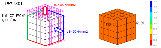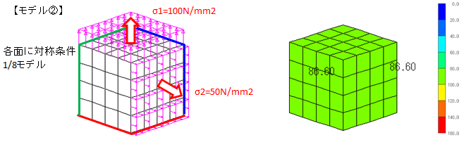 モデル①では,1軸方向に引張が作用しているのみでσ1=ミーゼス応力となる.