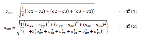 ①ミーゼス応力を簡単に言うと,多軸応力場において,1軸の引張り又は圧縮応力へ投影した値と考えることが出来る. ミーゼス応力は多軸応力場において,降伏点に達したらその材料は降伏すると判断する.