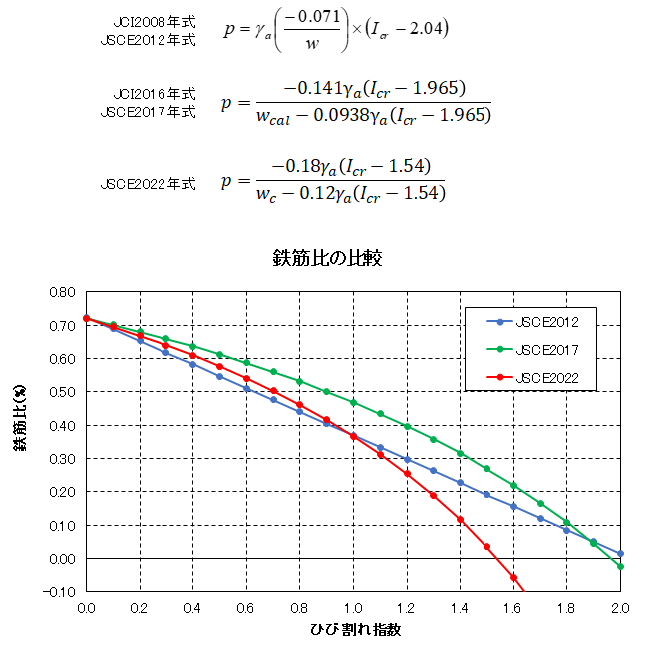 ◆JSCE2012⇒2017年基準改定時、ひび割れ指数が0.8~1.3の範囲で約0.1%もの鉄筋量が増加している.