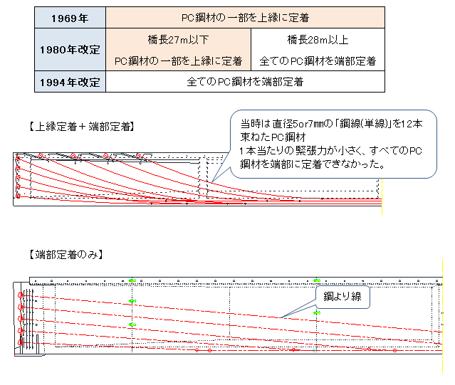 1993年以前に施工された橋梁(PC構造)では、主桁の主ケーブルを上縁定着されているものがあり、橋面防水が完全でなければ 定着部からシース内に水が浸入しPC鋼材を腐食させたり凍害による劣化を生じさせることがある。